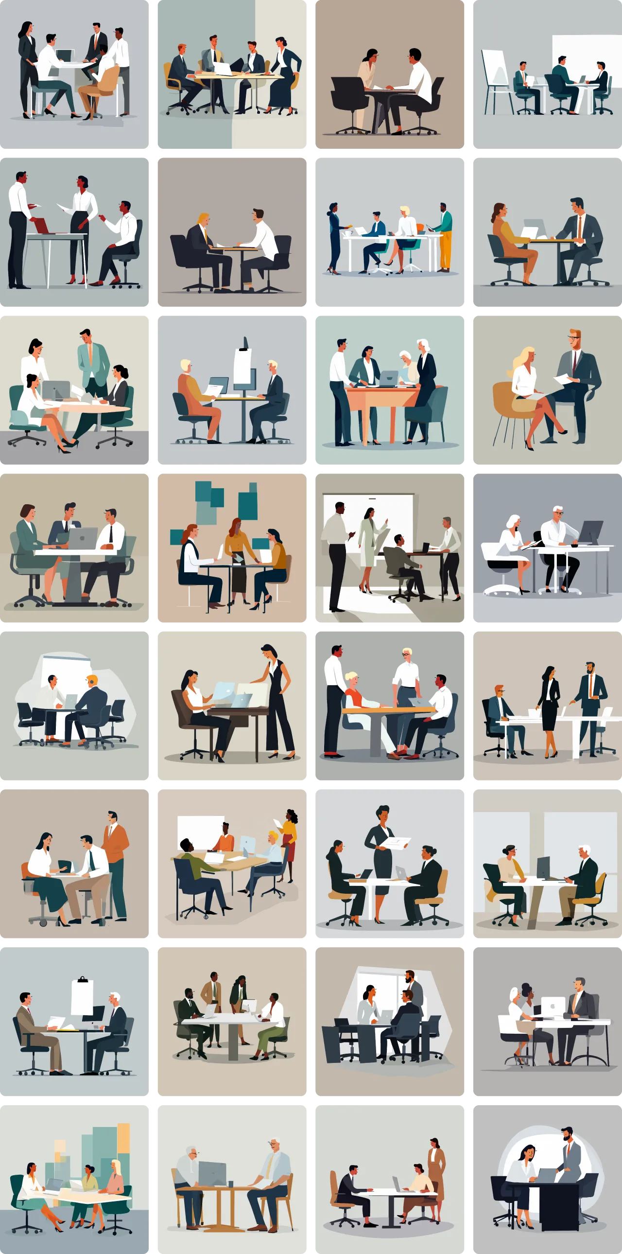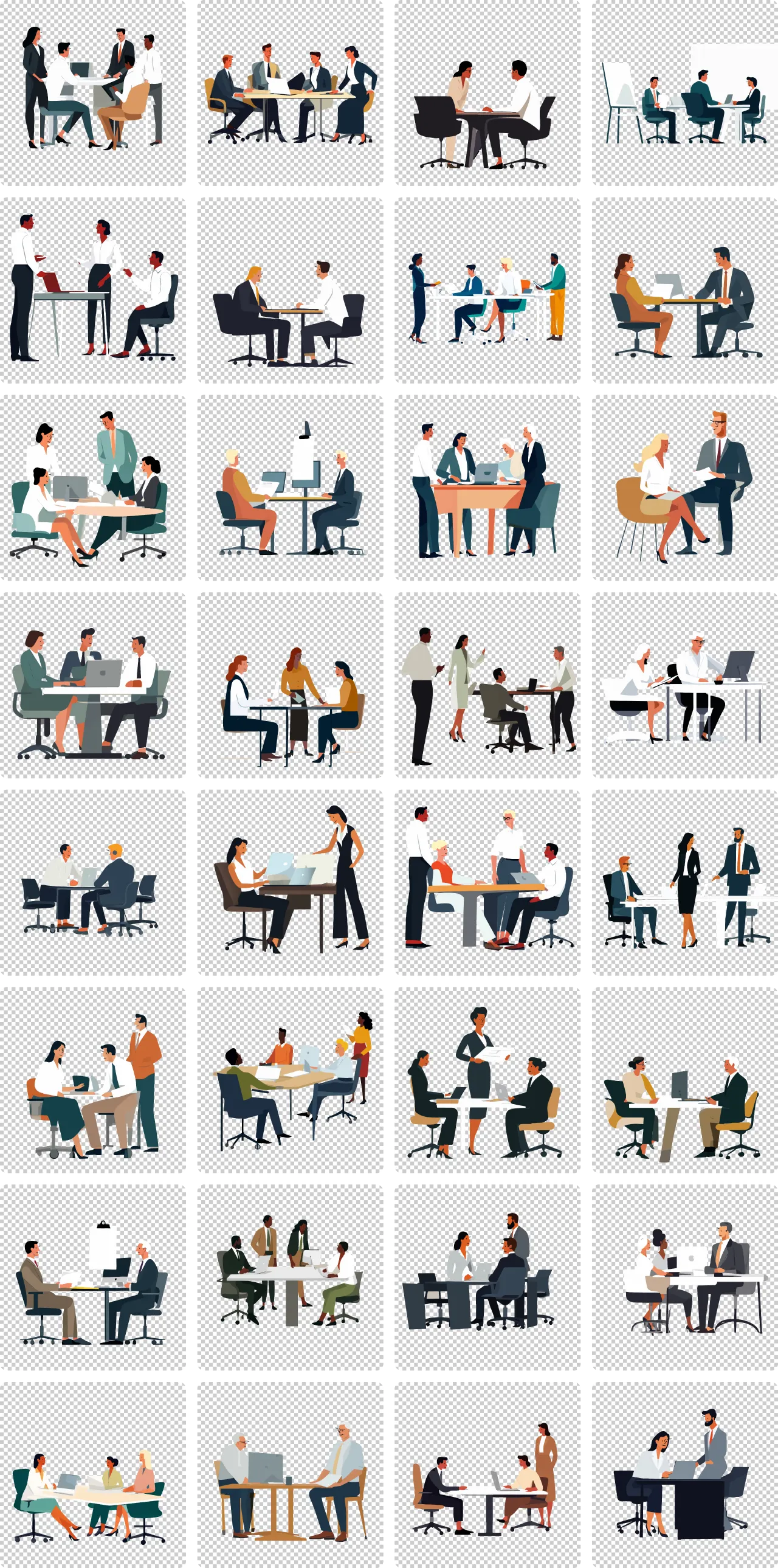 While the theme centers on meetings and discussions, the visuals are intentionally kept neutral, practical, and role-focused. This allows them to integrate seamlessly into a wide range of layouts without feeling overly illustrative or character-driven, making them ideal for everyday professional contexts.